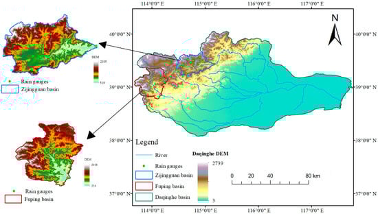 In this study, the Fuping Basin in the southern branch of the Daqing River Basin and the Zijingguan Basin in the northern branch of the Daqing River Basin were used as study areas for conducting an atmosphere–hydrology coupling simulation with real-time updating. The Fuping Basin is located at 113°45′–114°32′ E and 39°22′–38°47′ N, with a watershed area of 2210 km2. The entire territory is mountainous and can be divided into deep and shallow mountainous areas according to the terrain. The elevations of deep mountainous areas are higher than 800 m, while those of the shallow mountainous areas are between 200 and 800 m. The Zijinguan Basin is located at 114°28′–115°11′ E and 39°13′–39°40′ N, with a watershed area of 1760 km2. The two catchments are located in the Taihang mountain section and the upper reaches of the Daqinghe basin, with the maximum and the minimum elevation being 2286 m and 200 m above sea level. The elevation decreases from northwest to southeast and changes greatly. The steep terrain leads to a short confluence time of the flood, which together with high-intensity, short-duration precipitation is prone to cause severe flood disasters. They are concentrated in areas with thin soil layer and low vegetation coverage especially. Soil vadose zones are often in a state of water shortage. The runoff generation process is accompanied by a mixed mechanism of infiltration capacity excess and storage capacity excess. There were eight precipitation stations in the Fuping Basin and 11 precipitation stations in the Zijinguan Basin. The geographical location, topography, and distribution of the precipitation stations in the study area are shown in Figure 2. The duration and cumulative precipitation of 10 storm events are shown in Table 1. Duration, accumulated precipitation, and maximum stream flow of 10 selected 24 h storm events. The average annual precipitation in the basin is approximately 600 mm, with most of the precipitation occurs from late May to early September.