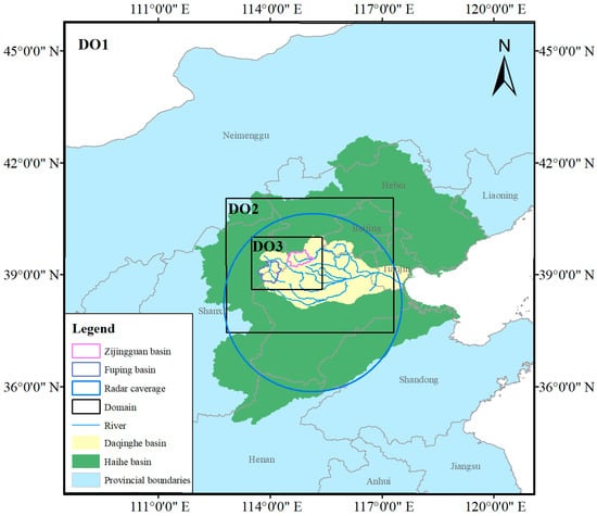 To ensure that the spatial resolution of the nested grid set was as close as possible to that of the radar data, a three-layer nested grid was used. Setting the outermost grid range was conducive for assimilating large-scale GTS data, making the model operation more stable. The innermost grid covered the entire study area. The nesting ratio of the adjacent nesting layers was set to 1:3, and the grid sizes were 1, 3, and 9 km. The inner and outer grids provide two-way feedback in the WRF model. The grid center of the study area was 39°26′00″ N, 114°46′00″ E, and the innermost nested grid (Domain 3) was 145 × 115 km2. The second-level nested grid (Domain 2) was 450 × 360 km2, covering the radar scanning range, and the outermost nested grid (Domain 1) was 1260 × 1260 km2. The nested grid and radar observation ranges in the study area are shown in Figure 3 and Table 3. The WRF model nested grid settings are shown. The three nested areas in this study were vertically divided into 40 layers. The top air pressure was 50 hPa [30], and the WRF model integration time step was 6 s. The WRF model was set to output simulation results every 1 h. The precipitation output of the WRF model was used to drive the WRF-Hydro model. Because the study basins are located in the mid-latitude region, the Lambert projection was selected. The initial and lateral boundary conditions for forecasting were provided by the 1 × 1° Global Forecasting System (GFS). The GFS data are real-time data provided by the National Environmental Forecasting Center (NCEP) and are updated every 6 h. Because the GFS data are released in real time, they are often used as the initial driving force for precipitation forecasting in the WRF model [31].