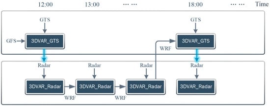 Although weather radar data can provide high-resolution instantaneous precipitation information, their coverage is limited compared to that of the GTS data; thus, they are more suitable for assimilation at small and medium scales. In this study, radar data were only assimilated in Domain 2, as the radar scanning radius used was 250 km, and its coverage area was between the outermost and innermost nested grids, similar to that of Domain 2. GTS data were complementary to the radar data, with wide coverage and low spatial density. Therefore, the GTS data were assimilated into Domain 1. As GTS data were updated every 6 h, in all assimilation schemes, GTS data were assimilated only at 6:00, 12:00, 18:00, and 24:00 after the beginning of precipitation, and radar data were assimilated every hour. Details can be seen in Figure 4. In this study, CV3, which is the error covariance of the global background constructed by the NCEP, was selected because of its wide applicability and adaptability for numerical atmospheric forecasting in any region.