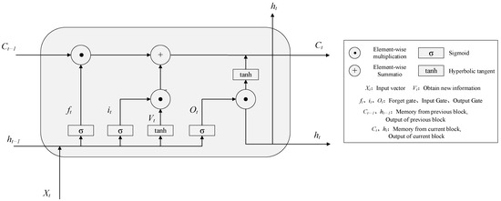 The LSTM network is a special cyclic neural network that allows previous input information to be stored inside it, thereby affecting the output of the network. Compared with traditional cyclic neural networks, LSTM adds memory cell units to the hidden layer, which can better remember longer historical information. A schematic diagram of the LSTM deep-learning model is shown in Figure 5.