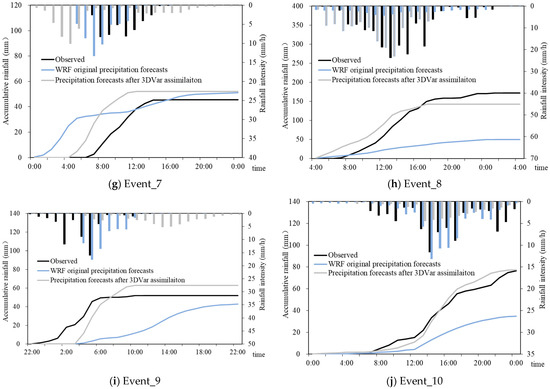 The CSI/RMSE index was used as a comprehensive measure to assess the forecasting results. As shown in Table 9, the CSI/RMSE value of the accumulated precipitation for each event improved after the data assimilation. For instance, in the absence of data assimilation, the CSI/RMSE value of Event_3 is 0.340, while after the data assimilation, it is 0.404. Similarly, without data assimilation, the CSI/RMSE value of Event_10 is 0.260, while after the data assimilation, it is 0.315. Following the data assimilation, the accumulated precipitation of all 10 storm events increased. Specifically, the precipitations of Event_3, Event_5, Event_6, Event_7, Event_9, and Event_10 increased by 18.86, 52.48, 28.00, 43.37, 25.49, and 21.27%, respectively. Thus, hourly data assimilation resulted in varying degrees of improvement in the WRF precipitation forecasting ability. Notably, the forecasting efficacy of Event_3, Event_5, Event_6, and Event_10 is significant, as reflected by the improved CSI/RMSE values compared to those of Event_7 and Event_9. In addition, the spatiotemporal variation coefficient Cv of precipitation in Table 2 suggests that Event_7 and Event_9 are more unevenly distributed in both space and time. This further indicates that the model is more inclined to accurately forecast precipitation processes with uniform spatial and temporal distributions.