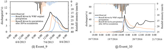 Nevertheless, the degree of improvement was nonlinear. Data assimilation improves the accuracy of precipitation forecasts, thereby improving the runoff forecast results of land surface hydrological models. The extent of improvement in the precipitation forecast by data assimilation cannot determine the extent of improvement in the runoff forecast. For example, the precipitation RMSE of Event_7 and Event_9 improved by 84.70 and 83.10%, respectively, after assimilation. These were the greatest improvements among the 10 storms events; however, the runoff forecast results did not significantly improve after assimilation. After the data assimilation, Rf of Event_7 precipitation decreased by 17.30%, Rv decreased by 11.65%, and the NSE increased by 0.29; Rf of Event_9 precipitation decreased by 6.99%, Rv decreased by 23.95%, and the NSE increased by 0.48.