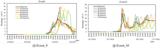 Figure 8 shows hydrographs of the forecasted results and actual observations of the 10 storm events with different forecast lead times. The LSTM model performed well in the real-time correction of runoff forecasting, especially for a lead time of 1 h. For a lead time of 3 h, the forecasting results of the runoff process were close to the actual values. For a lead time greater than 6 h, the degree of improvement due to real-time correction on runoff forecasting of the coupled system decreased markedly, while the forecasting fluctuation increased; however, the peak flow and flood volume did not increase or decrease significantly. This is because with the extension of the forecast lead time, the correlation between the forecast errors decrease, and it is difficult for the LSTM model to accurately learn the characteristics of the forecast errors of the coupled system.