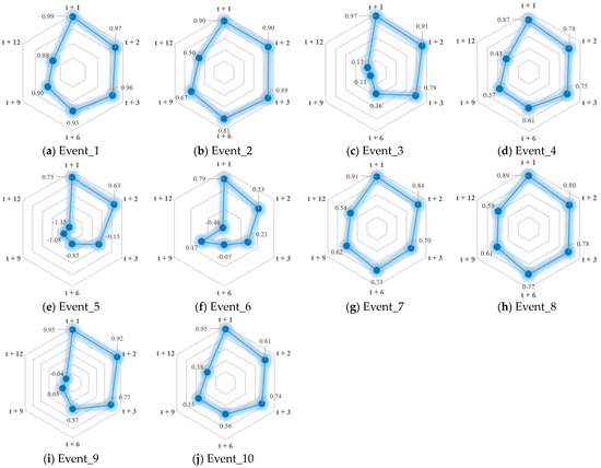 Table 11 lists the evaluation indices for the real-time runoff forecasts with different lead times updated by the LSTM. It can be seen that after introducing the LSTM model into the WRF/WRF-Hydro coupled system, the forecasting accuracy of each flood is significantly improved. Specifically, after adding the real-time correction, the fitting of the discharge hydrograph is better, and the NSE is also greatly improved. The NSE values of the forecasting correction results for a lead time of 1 h for all 10 storm events are between 0.75 and 0.99, and the average NSE is 0.90. The correlation between the peak flow and flood volume is good, and the forecasting results are very close to the observations, which shows that the introduction of the LSTM model can increase the flood forecast accuracy. As the lead time increases to 12 h, the NSE is between −0.46 and 0.88, and the average NSE is 0.16, while the correlation between the peak flow and flood volume is poor. Until a lead time of 6 h, the forecast accuracy decreases slowly, while still having a good forecast correction effect. When the lead time is greater than 6 h, the forecast accuracy decreases rapidly, with Rf in all events except Event_10 being within the range of (−10%, 10%). The LSTM model for a lead time of 3 h has relatively high accuracy, with Rf in most events being within the range of (−20%, 20%); however, there are exceptions, for example, for Event_3 and Event_9, Rf of the forecasted values for a lead time of 3 h are 36.39 and 75.22%, respectively. In general, Rf and Rv are low in the runoff forecast for lead times of 0–3 h. However, because the forecast discharge hydrograph fluctuates greatly with the lead time extension, the peak flow and flood volume do not show obvious trends with longer forecast lead times.