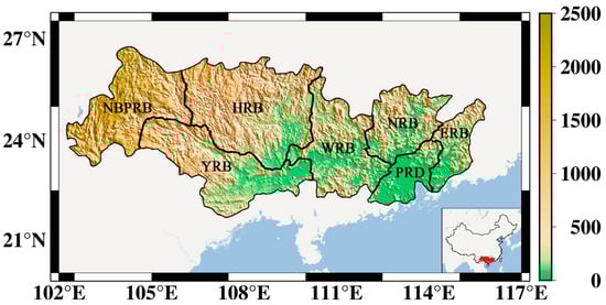 The PRB (Figure 1), approximately located at 21° N–27° N and 102° E–116° E, covers five provinces in South China and northeastern Vietnam, with a total area of 442,000 km2. The terrain is high in the northwest and low in the southeast. The region has the subtropical monsoon climate, with a mild and rainy climate. The annual average temperature is 14~22 °C and the annual average PPT is 1200~2200 mm. PPT distribution obviously decreases gradually from east to west. The spatial and temporal distribution of PPT is uneven, and more than 80% of PPT is concentrated in the rainy season [,]. The sub-basins of the PRB are the Nan-Bei Pan River basin (NBPRB), the Hongliu River basin (HRB), the Yu River basin (YRB), the West River basin (WRB), the North River basin (NRB), the East River basin (ERB), and the Pearl River Delta (PRD).