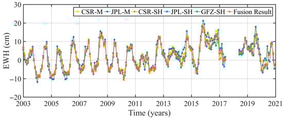 We fused the TWSC results from six GRACE solutions to improve the reliability of TWSC results. Figure 2 shows that fused results are in good agreement with TWSC results from six single solutions, and correlation coefficients between fused results and TWSC results from six single solutions are larger than 0.95. The fused results (3.183 mm) offer less uncertainty than the one of the results from six single solutions (CSR-SH, 13.596 mm; GFZ-SH, 15.434 mm, JPL-SH, 12.711 mm; CSR-M, 33.570; JPL-M, 23.902).
