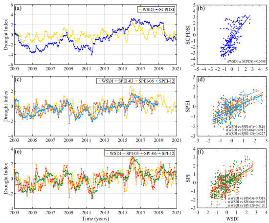 The time series of WSDIs and traditional drought indices (a,c,e) and comparison scatter plots (b,d,f) in the PRB during 2003–2020. (a,b) The WSDI and the SCPDSI; (c,d) the WSDI and SPEI-3, SPEI-6, and SPEI-12; (e,f) the WSDI and SPI-3, SPI-6, and SPI-12.