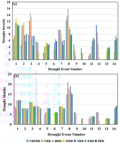 In our study, the WSDI was used to monitor and characterize droughts in the PRB and its sub-basins from 2003 to 2020 (Table 1 and Figure 4). The fourteen droughts occurred in the PRB during the study period. Among them, the worst drought occurred from November 2010 to July 2012, whose peak magnitude and drought severity values were −0.6143 and −12.4149, respectively, which is also the longest one (21 months). During this drought, the HRB was most affected (−14.6244). The seven droughts belonged to the basin-wide one (nos. 1, 2, 3, 5, 7, 8, and 11). During the seven droughts, the most severely affected sub-basins were the WRB (12.7318), the WRB (11.4342), the HRB (14.6244), the WRB (5.3541), the NBPRB (9.5206), the HRB (15.7994), and the ERB (6.8657). During the study period, the WRB and the HRB suffered the most droughts (12). In non-basin-wide droughts, the no. 10 drought (June 2014 to August 2014) only affected two sub-basins (the NBPRB and the YRB). Four droughts mainly occurred in the middle and upper reaches, while three ones mainly appeared in the lower reaches. Among the droughts that occurred in the middle and upper reaches, the most affected sub-basins were all NBPRBs, while the ones that occurred in the lower reaches were all ERBs during the droughts. Therefore, the NBPRB, the WRB, the HRB, and the ERB were found to be the most drought-prone. With 14 droughts, the drought duration varied across sub-basins (Figure 4b). For example, in the no. 8 drought (November 2011 to July 2012), the YRB had the longest drought months (12 months), followed by the NRB (19 months), the HRB (18 months), the WRB (17 months), the ERB (16 months), the NBPRB (15 months), and the PRD (15 months).