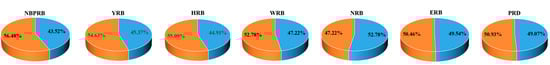 In the PRB (Figure 9b), the peak magnitude of 81.82% of droughts (9) increased. The largest increase in the peak magnitude was 0.6386 (no. 5), and the maximum growth rate was 133.89% (no. 12) and the minimum growth rate was 3.29% (no. 1). There were two droughts with declines in the peak magnitude, and the reduction rates were 5.10% and 16.21%. However, there are large differences in the results affected by human activity between the sub-basin and the PRB. Except for the WRB and the PRD, at least 50% of drought peaks were weakened in the other five sub-basins. In the NBPRB and the HRB, the peak magnitudes of 55.56% droughts were cut. Droughts with the largest peak reductions occurred in the HRB (91.13%). The seven sub-basins were sorted in ascending order of the average peak magnitude reduction levels, and their arrangement was as follows: the NRB (39.29%), the HRB (37.01%), the WRB (35.37%), the NBPRB (26.71%), the ERB (26.24%), the PRD (20.84%), and the YRB (15.13%). Combining the probability and procedures of peak magnitude reduction, the HRB was found to be the sub-basin with the largest peak magnitude reduction. Human activity had an effect on reducing the peak magnitude and the ability to exacerbate them. According to statistics, the PRD had the highest probability of the exacerbated peak magnitude (70%). The average peak magnitude intensification levels in each sub-basin were as follows: the NBPRB (349.58%), the YRB (118.05%), the HRB (105.75%), the WRB (36.59%), the NRB (56.20%), the ERB (53.40%), and the PRD (140.52%). Although the average level in the NBPRB was greater than that in the PRD, only two droughts in the NBPRB had peak magnitude intensification. In the PRD, there were seven occurrences of this situation. Therefore, the PRD was found to be a sub-basin with the largest peak magnitude intensification.