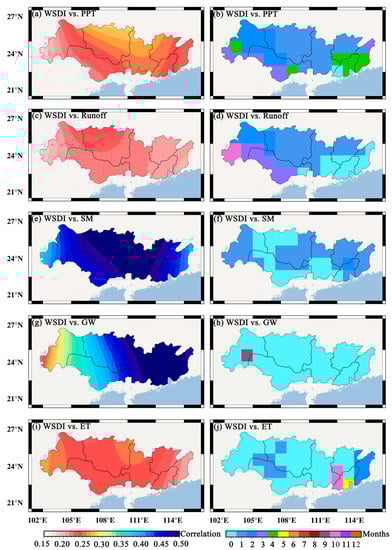 The spatial distribution of maximum correlation coefficients (a,c,e,g,i) and the corresponding time delay months (b,d,f,h,j) between the WSDI and PPT, runoff, SM, GW, and ET anomalies.