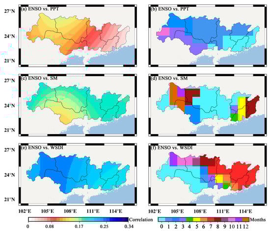 The spatial distribution of maximum correlation coefficients (a,c,e) and the corresponding time delay months (b,d,f) between the ENSO index and the WSDI, PPT, and SM anomalies.
