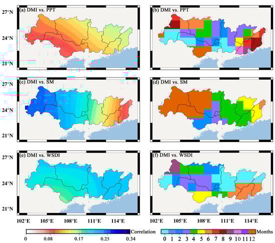 The spatial distribution of maximum correlation coefficients (a,c,e) and the corresponding time delay months (b,d,f) between the DMI and the WSDI, PPT, and SM anomalies.