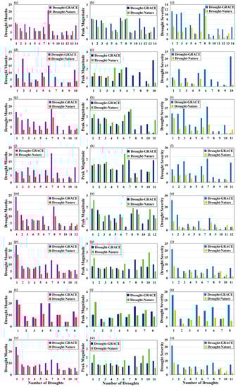 Since the impact of human activity on droughts is difficult to estimate, we used indirect methods for evaluation purposes. We used natural-induced TWSCs to monitor and characterize the droughts in the PRB (Table A1). Figure 9 compares the characteristics of droughts caused by natural factors and actual occurrences (drought-nature and drought-GRACE) in the PRB and its sub-basins. Comparing Table 1 and Table A1, the number of drought natures (11) was significantly less than the number of drought GRACE indices (14) in the PRB. This shows that three droughts were caused by human activity. Expect for the ERB, the above situation existed in each sub-basin, and the NBPRB had the most human-induced droughts (3). Figure 9a shows that drought duration extensions appeared in 81.82% of droughts (9) due to human activity. The longest increase in drought duration reached 10 months (no. 8), and the average value was 4 months. The highest increase rate in drought duration was 125% (no. 7) and the average value was 75.37%. The duration of one drought (no. 13) was shortened by 3 months due to human activity, while there was one drought (no. 6) whose duration did not change due to human activity. As shown in Figure 9, due to human activity, the drought with the longest prolonged drought (18 months) occurred in the YRB. The greatest increase in the average drought duration was found in the NBPRB and the ERB (both 6.5 months), and the smallest one was found in the NRB (3.3 months). The drought with the greatest increase rate of the drought duration appeared in the YRB (600.00%). The greatest average increase rate in drought duration was found in the NBPRB (186.31%) and the smallest one was found in the NRB (81.75%). Across the study regions, time extension was the main effect of human activity on drought duration, but duration was also shortened in sporadic droughts.