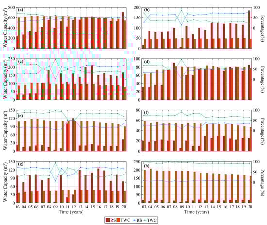 The annual RS and TWC results in the sub-basin of the PRB (a) and its sub-basins (NBPRB, (b); HRB, (c); YRB, (d); WRB, (e); NRB, (f); ERB, (g); PRD, (h)) during 2003–2020. The bule and green lines represent RS and TWC as a percentage of human-induced TWSC.