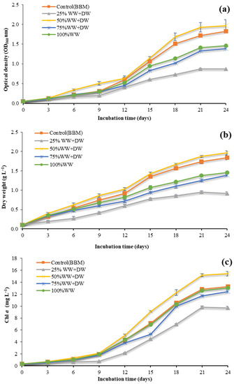 Growth curves of Chlorococcum sp. investigated in the present study over the course of 24 days: (a) optical density; (b) dry weight; (c) chlorophyll a.