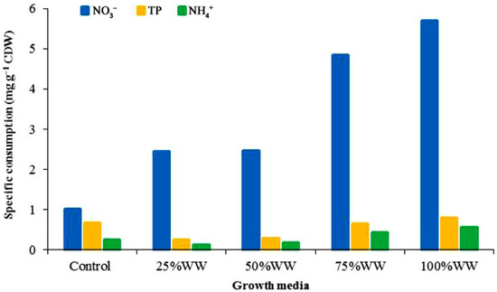 Specific consumption of nitrogen and phosphorous (mg g−1 CDW) by Chlorococcum sp. cultured for 24 days under control and varied concentrations of wastewaters.