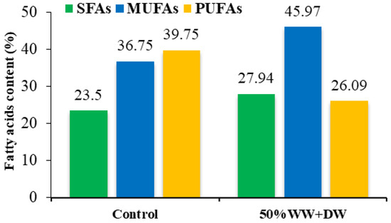 As mentioned in the previous section, Chlorococcum sp. demonstrated high lipid productivity in the 50% WW treatment. Gas chromatography−mass spectrometry (GC−MS) was used to analyze the fatty acid profile and compare it to the control. As shown in Table 4 and Figure 4, the 50% WW treatment had higher values of monounsaturated and saturated fatty acids as compared to the control, i.e., 45.97% and 27.94% vs. 36.75% and 23.50%, respectively. It is worth noting that a much lower value of polyunsaturated fatty acids was recorded in the 50% WW treatment (26.09%) than in the control (39.75%). The fatty acid profile of Chlorococcum sp. in general had carbon chains ranging from C15 to C18. The monounsaturated oleic acid (C18:1) was the predominant fatty acid species in both the control and the 50% WW treatment. However, its relative content in the 50% WW algal treatment (44.43%) was higher than the control (36.75%). It is worth indicating that Chlorococcum sp. revealed a higher content of fatty acids in the wastewater treatment than in the control, except for linoleic acid (C18:2). Our findings indicated that the fatty acids profile of the tested microalgal strain made it a good choice for a feedstock in the production of biodiesel. Microalgae growing in wastewater have an advantage because of the rise in fatty acids (C16−C18) in 50% WW. Because of the predominance of saturated fatty acids, the fuel shows oxidative stability [40].
