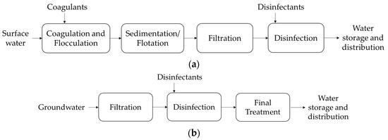 The greater awareness of these ongoing problems has led to the establishment of more rigorous policies by the European Union for the control of the quality of drinking water. These policies have the aim of ensuring that safe drinking water can be distributed to everyone [1,2]. To guarantee safe drinking water, the water must be subjected to a treatment process that includes coagulation and flocculation, sedimentation/flotation, filtration, and disinfection prior to being stored and supplied. Such a process is shown in Figure 1a, illustrating a case when surface water is used as the primary water source [1]. However, if the primary source water is groundwater, the stages for its treatment are reduced, with the filtration, disinfection, and a final treatment (e.g., chemical or UV) being applicable, followed by storage and distribution—Figure 1b [5].