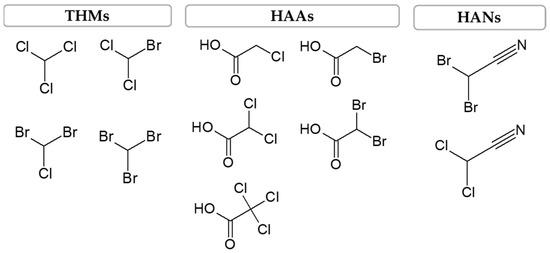 DBPs include several halogenated organic compounds, such as trihalomethanes (THMs), haloacetic acids (HAAs) and haloacetonitriles (HANs). From the aforementioned DBPs, the THMs are the most common, followed by the HAAs, which can be present in finished water at concentrations on the order of µg/L, and as for the HANs, they can be found in concentrations as low as ng/L and up to µg/L [14]. However, regarding their toxicity, HANs are the most toxic, followed by HAAs and, finally, by THMs. The THMs group is characterized by its composition of volatile compounds, such as chloroform, bromodichloromethane (BDCM), chlorodibromomethane (CDBM) and bromoform, while HAAs include monochloroacetic acid (MCAA), dichloroacetic acid (DCAA), trichloroacetic acid (TCAA), monobromoacetic acid (MBAA) and dibromoacetic acid (DBAA) and HANs include dichloroacetonitrile (DCAN) and dibromoacetonitrile (DBAN)—Figure 2 [3,7,14].