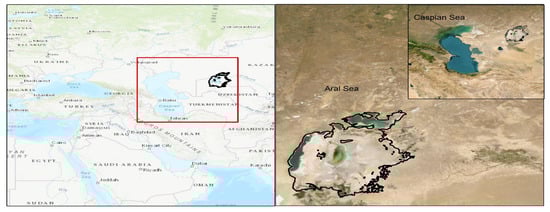 The Aral Sea is in Central Asia and straddles the borders of Kazakhstan and Uzbekistan (Figure 1). The sea was once the fourth-largest lake in the world; however, due to extensive water diversion for irrigation purposes that started in 1990, it has shrunk significantly over the past few decades. The region surrounding the Aral Sea is characterized by a dry desert climate, and the landscape is dominated by flat, sandy plains. Geologically, the area is situated in a tectonic basin, which is surrounded by several mountain ranges. Hydrologically, the Aral Sea is fed by two major rivers, the Amu Darya and the Syr Darya, both of which originate in the Pamir Mountains. However, due to extensive irrigation and water diversion for agriculture, the inflow of these rivers has been significantly reduced, causing a desiccation process carried on by the successor states around the Aral Sea [1]. These problems are generating severe environmental, economic, and human catastrophes, and, at the present time, no solution has been outlined by a feasible plan of action. Hence, the monitoring of the process and forecasting of foreseeable future scenarios with the use of geoscience and geoinformatics tools are essential contributions.
