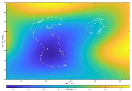 Subsequently, a linear trend on the gravity anomaly time series was fitted to capture long-term variations. The resulting trends are visualized in Figure 2 [33]. Apparently, mass variations of the Caspian Sea have an impact on the gravity anomaly variations of the Aral Sea. Therefore, in the present study, the gravity anomaly time series over the Aral basin was corrected for the gravity variations of the Caspian Sea. For this purpose, the prism modeling described in [40] was used. Since the effect of the Caspian Sea is orders of magnitude smaller than that of the Aral Sea (when the location of the calculation is the center of the Aral Sea), an approximate modeling of the Caspian Sea mass variations was deemed to be sufficient. Accordingly, the shape of the Caspian Sea was replaced with a rectangle with the same area (400 km wide and 927.5 km long, equivalent to the 371,000 km2 area of the Caspian Sea) and positioned in the geometrical center of the Caspian Sea (Figure 3). This way, by multiplying the area of the rectangle with the height variations of the water level, the Caspian Sea was simplified to a single prism. Figure 4 shows the time series of the gravity anomaly at the center point of the Aral Sea (60.4° E, 44.9° N), along with the impact of the Caspian Sea at this point. The impact of the Caspian Sea is negligible; however, it may impact the comparison regarding the specific properties of the water bodies. Subsequently, to focus on the trend of variations, seasonality was removed from the times series (Figure 5) and used for further comparison.