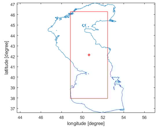 Simplified model (red box) of the Caspian Sea (blue curve) positioned in the geometrical center (red asterisk) to estimate its remote gravitational effect in the Aral Sea region.