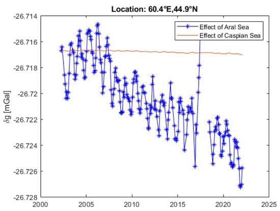 Gravity anomaly time series at a central point (60.4° N, 44.9° E) of the Aral Sea with the gravitational effect of the Caspian Sea at the same location.