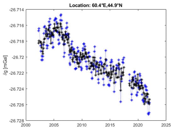 Gravity anomaly time series with seasonal (annual and semi-annual) component at the central point (60.4° N, 44.9° E) of the Aral Sea removed (black) vs. the original gravity anomaly time series (blue).
