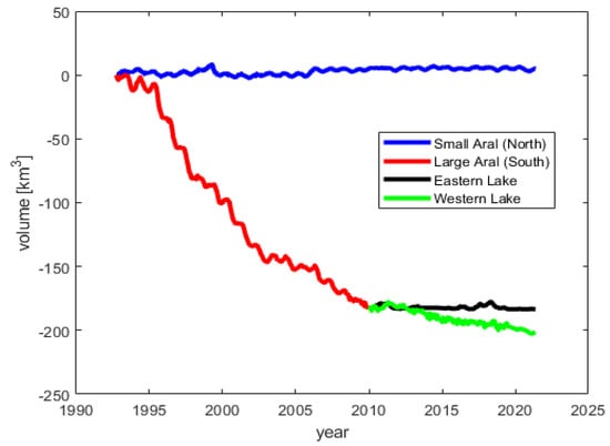 Modeling of the water volume was performed using the Hydroweb data [45]. The data consist of water level, area, and volume information from 1992 to the present day with a nominal temporal resolution of 10 days. To eliminate seasonal variations, annual averages were determined. In Figure 6, water volume data for the Aral Sea are displayed separately for the northern (Small Aral Sea) and the southern reservoirs (Large Aral Sea), where the latter has split into eastern and western lakes around 2010 and is displayed separately from then on. Water volume exhibited a relative change with respect to the first epoch. The total water volume variation was determined by combining the separated basins’ volumes.