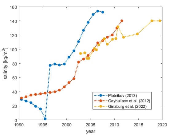 An attempt at modeling salinity was made based on available information. Note that salinity is not observed and published regularly; therefore, only inconsistent data are available, with significant gaps between epochs. Three different time series of salinity observations, presented by Plotnikov [46], Gaybullaev et al. [47], and Ginzburg et al. [48], have been utilized for the present study.