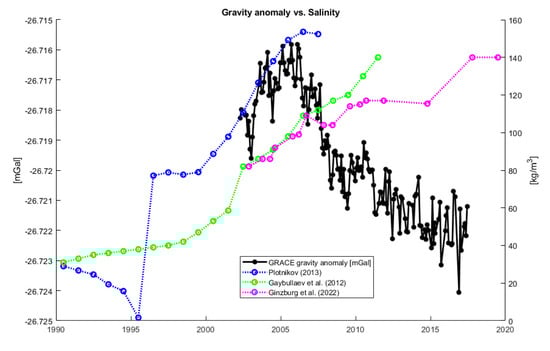 These models are shown in Figure 7, neglecting the historical data up to 1990. From 1990 to 1996, the time series of Plotnikov [46] differs relevantly from Gaybullaev et al. [47]; after that, both sources show a gradual increase from 1996 to 2005, with a bias of approximately 30–40 kg/m3 between them. The results of Ginzburg et al. [48] tend to be more consistent with those of Gaybullaev et al. [47]; nonetheless, considerable deviations can be observed at certain epochs, indicating that salinity data depend on the method and the place of the observations, and that they, consequently, cannot be considered reliable.