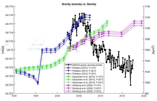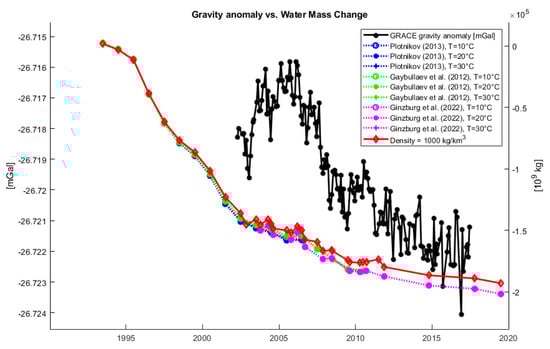 Correlation between water mass change and gravity anomaly. The density is determined by using the salinity models obtained from Gaybullaev et al. [47] and Ginzburg et al. [48], with three different constant values for the temperature.