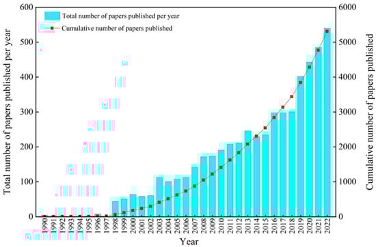 Distribution of the number of literature in the field of drip irrigation from Web of Science in 1990–2022.