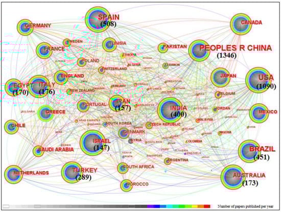 Distribution map of drip irrigation. Note: Font size represents the number of papers published; the larger the font, the more papers published; the numbers on the graph are the number of publications. Different colors represent the number of papers published in each country from 1990 to 2022. Connectivity between countries represents cooperation.