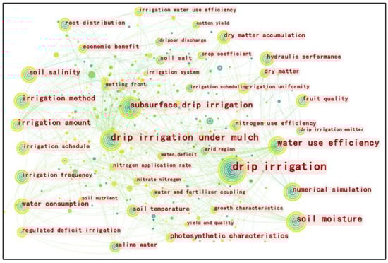 The advanced irrigation and fertilization technology created and developed by Israelis in the 1960s was the world’s first drip irrigation system. This technology innovatively integrates the two important technologies of irrigation and fertilization in crop production, dissolving the fertilizer in water and applying it with the water through the irrigation system, with a reasonable proportion of nutrients according to the needs of the crop, and supplying the right amount at the right time, which is highly controllable. Firstly, by searching the keywords “drip irrigation” or “drip irrigated” or “trickle irrigation” or “drip fertigation”, 5311 papers were downloaded from the Web of Science core collection between 1990 and 2022 []. Secondly, we used CiteSpace software to construct representative data of literature records in the field of drip irrigation research. Then, a visual stepwise synthesis co-citation network was constructed to visually analyze the structure of drip irrigation research []. Through an analysis of literature metrology software, it was found that drip irrigation was becoming a research hotspot, and the number of papers related to drip irrigation increased year by year from 1990 to 2022 (Figure 2). Countries with more papers published include China, USA, Spain, Brazil, India, etc. (Figure 3).