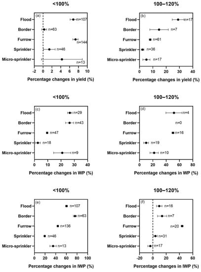 The effects of drip irrigation on crop yield, WP, and IWP as a percentage change in the control for different irrigation methods. A total <100% and 100–120% mean the drip irrigation amount is less or higher than the amount of the five irrigation methods. If there is an overlap between the error bar and the Y axis, it is considered that there is no significant difference between the control group (five irrigation methods) and the experimental group (drip irrigation); otherwise, it is considered to be significant. Subfigures (a,b) are the effects of drip irrigation on crop yield as a percentage change in the control for different irrigation methods under <100% and 100–120%, respectively. Subfigures (c,d) are the effects of drip irrigation on WP as a percentage change in the control for different irrigation methods under <100% and 100–120%, respectively. Subfigures (e,f) are the effects of drip irrigation on IWP as a percentage change in the control for different irrigation methods under <100% and 100–120%, respectively.