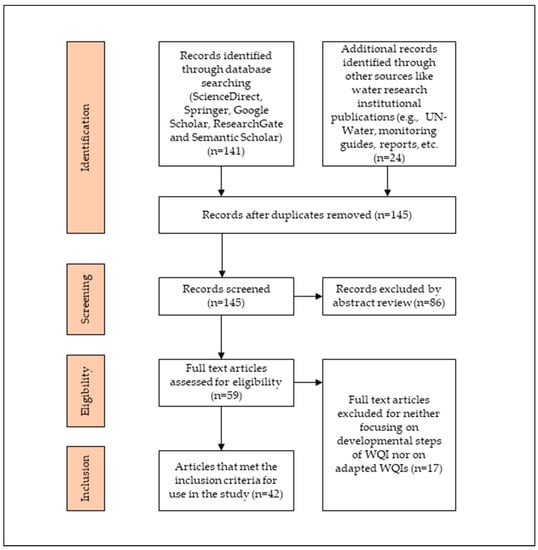 Articles were collected and analysed between March 2021 and June 2022 from five electronic databases: ScienceDirect, Springer, Google Scholar, ResearchGate, and semantic scholar. The search keywords included: “water quality index”, “Africa”, “surface water”, and “groundwater” for the past ten years. Only studies that evaluated water quality using the original WQI of another author or authors incorporating physical, chemical, and microbiological parameters were included. The different modification approaches included replacing the type and/or quantity of WQPs, modification of either of the developmental steps and changing the application or usage of the WQI. Articles that developed a new WQI approach were excluded because the objective of the review was to explore adapted WQI and not original models. MS Excel 2019 was used for graphic presentations, Sigma Plot v.14 for descriptive statistics, and Xlstat 2019 v.2.2 for multivariate analysis to identify the most popular WQP combinations and average linkage between the WQPs as used by authors.
