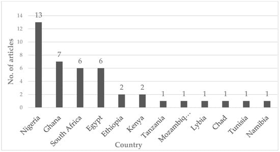 The reviewed articles were a collection from 12 African countries (Figure 2), with Nigeria recording the highest number of modified WQIs—Tanzania, Mozambique, Libya, Chad, Tunisia, and Namibia, with the least.