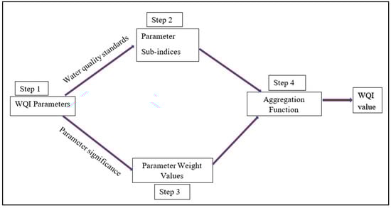 A WQI is a tool that describes the overall water quality by combining or summarizing complex and technical water quality information into a single unitless numerical value [3,4,5]. Therefore, WQIs are used to predict water quality status since they reflect the overall impact of multiple WQPs and allow for comparing water quality status across time and space [6]. Specifically, WQIs are used to: (i) communicate information about water quality to the general public, policymakers, and non-water experts in a straightforward manner [7] and (ii) improve the understanding of general water quality issues by stakeholders in the decision-making process.