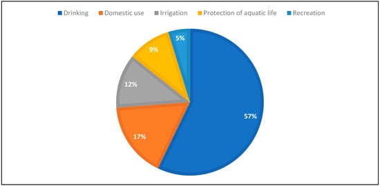 Based on the overall index value, the water quality was rated using a categorisation scheme [83]. About 66.7, 28.6, and 4.7% of the articles focused on surface water [39,40,41,42,59,68,69,70,71], groundwater [48,49,63,81,82,84], and a combination of both surface and groundwater [58,80,85,86,87] respectively. The types and extent of the various societal needs addressed by the articles are shown in Figure 4. More than half of the reviewed articles addressed water for drinking purposes.