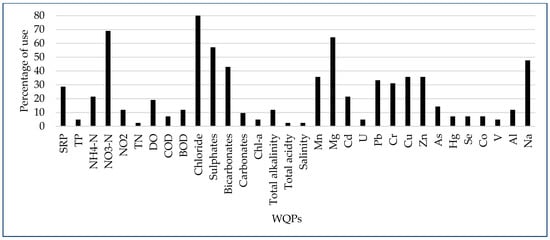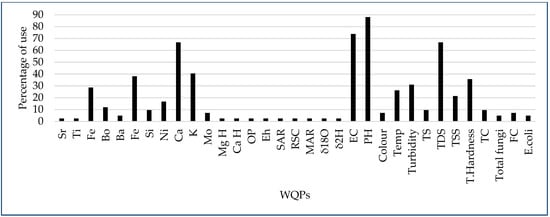 From the articles reviewed, 65 WQPs were identified. On average, the articles focused on 14 WQPs with a minimum of 4 and a maximum of 24, which examined the quality of swimming pool water for bathing [87] and the applicability of lake water for irrigation [39] respectively. It has been affirmed that various physical, chemical, and biological factors influence the level of contamination in a specific aquatic system [7]. These categories were employed by authors in the current investigation and are detailed in Table 2.