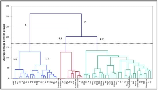 Multiple WQPs were clustered to determine the frequently employed pairing by the articles examined (Figure 7). The cluster analysis connected WQPs based on the distance between parameters, and the more dissimilar the parameters were, the larger the distance was between them. All WQPs were grouped into four sub-clusters and two major clusters (Clusters 1 and 2) and (Sub-clusters 1.1, 1.2, 2.1 & 2.2). Cluster 2 was more heterogeneous with more homogeneous characteristics, while Cluster 1 was more homogeneous with a flatter dendrogram. Both clusters had two sub-clusters, with each sub-cluster bearing various combinations.