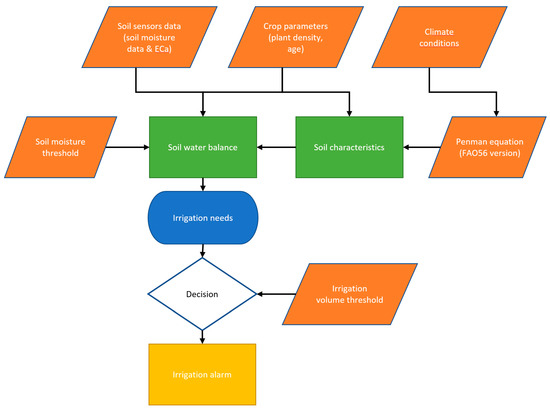Irrigation needs per tree of each parcel were determined based on the meteorological data (recorded by the nearby weather station) using the Penman equation (FAO56 version). In addition, as a parallel and more accurate process, the soil moisture data were used to confirm or reduce/postpone the need for the applied irrigation dose per tree proposed by the Penman equation. Specifically, the irrigation model is responsible for calculating the weekly amount of water that olive trees need to reach the desired soil moisture level. It can be used for any irrigation method, but in this case, it concerns drip irrigation as it is the dominant irrigation method for the specific areas. Specifically, each node (soil sensor) every week automatically calculates the amount of water needed to reach the desired soil moisture level for the corresponding studied parcel, in turn the system sends a mail alarm notification to the farmer to irrigate. A schematical representation of the different components of the incorporated IoT platform irrigation model is depicted in Figure 5.