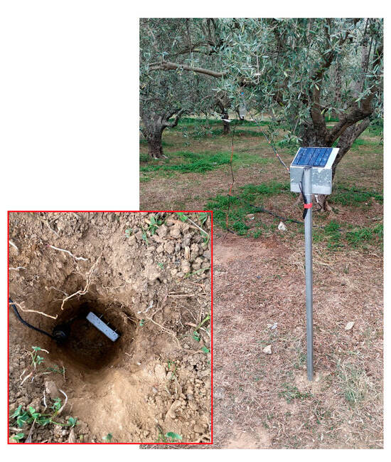 A node with a smart soil sensor was installed in each plot of olive trees to take measurements of soil moisture, electrical conductivity and temperature in real time placed at a soil depth of 30 cm. Maintaining water content in the soil at a constant level indicates that irrigation is applied at the rate of water intake from the crop. As mentioned above, experiments have found that a representative depth to monitor soil moisture for mature olive trees is at 30 cm [26]. Thus, the soil moisture sensors were installed at 30 cm soil depth for each irrigated olive grove.