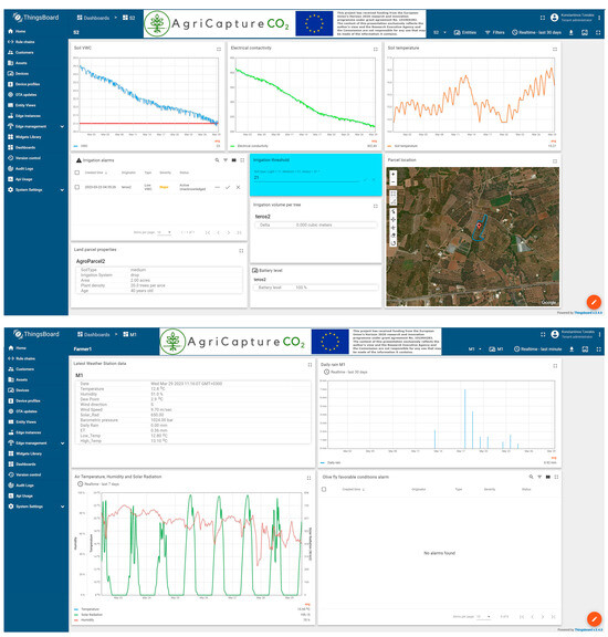 In order to visualize the data from the devices, different dashboards have been created for each parcel with olive trees, which are visible to the farmer who owns the parcel.