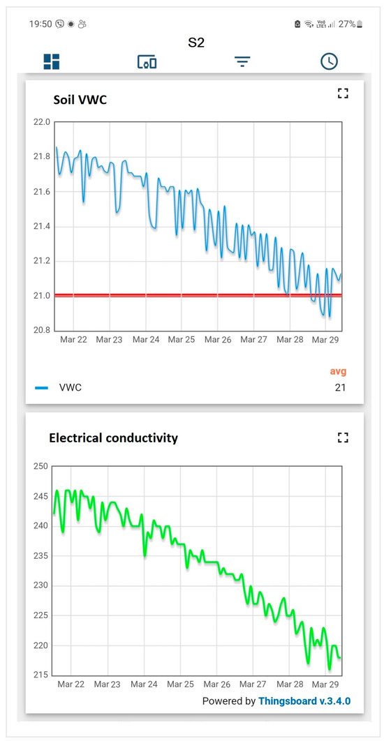 In the literature there are studies that propose the installation of soil moisture sensors at more than one soil depth. This approach has some pros (such as better monitoring of the soil profile) but also several cons, such as cost, risks of damage during fieldwork, the practical management and the inherent complexity of integrating data from different soil depths into a final and clear suggestion/decision for the user [26,45]. Additionally, for some crops such as olives, which have a relatively shallow root system and the effective root zone is usually up to 30 cm soil depth, the selection of a representative soil depth for monitoring purposes could be considered sufficient [30]. It should be noted that the functionality of soil moisture data loggers in the field have already been validated and customised to the farmer’s needs.