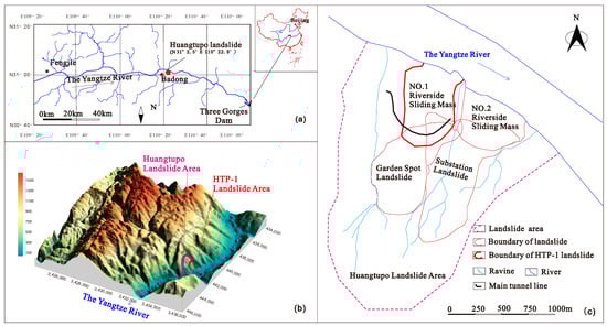 Groundwater is known to play a significant role in the triggering and reactivation of deep-seated landslides [1,2,3]. However, conventional hydrogeological investigations have limitations in their applicability to such landslides, which typically have anisotropic and heterogeneous media [4,5,6,7,8]. The Huangtupo landslide in the Three Gorges Reservoir area is one such landslide that has attracted considerable attention in China due to its large-scale, complex geological structure, and high potential hazard (Figure 1). The recent monitoring data indicate that, among the four parts of the Huangtupo landslide, the deformation speed caused by rainfall in the front area of the NO.1 Riverside Sliding Mass (HTP-1) is about 5mm per month [9], while the overall deformation of the other three landslide masses is relatively small [10]. Therefore, the NO.1 Riverside Sliding Mass has become the focus of landslide research (Figure 1c). Previous studies on the hydrogeology-related inferences of HTP-1 have mostly relied on planar geological surveys and monitoring of borehole water levels, and no targeted research has been conducted to investigate the groundwater source in the landslide [11].