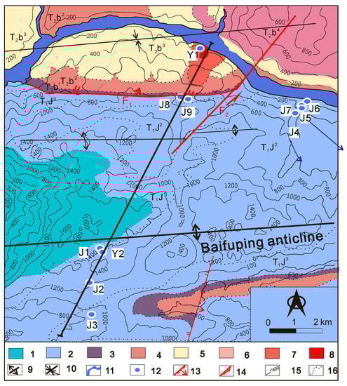 Geological map of study area. Legend: 1. T1d; 2. T1j; 3. T2b1; 4. T2b2; 5. T2b3; 6. T2b4; 7. Huangtupo landslide; 8. HTP-1 landslide; 9. anticline; 10. syncline; 11. water line; 12. sampling point; 13. Badong fault; 14. strike fault; 15. contour line; and 16. stratigraphic boundary.