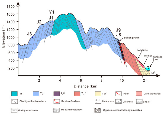 The main lithologies of the study area comprise a succession of sedimentary rocks belonging to the Upper Triassic Badong Formation and Lower Permian Jialingjiang Formation and Daye Formation. The Badong Formation consists of three sections (T2b1, T2b2, and T2b3) that exhibit varying lithologies. The first and third sections of the formation are primarily composed of muddy limestone, and are mainly carbonate rocks and developed with structural fractures and dissolution fractures, while the second section consists of interbedded sandstone and mudstone. In contrast, the Jialingjiang Formation (T1j) is mainly composed of limestone and dolomite, while the Daye Formation (T1d) is characterized by the presence of micritic limestone and shale. Of particular note, gypsum-cemented conglomerates are developed near the contact zone between the Badong Formation and the Jialing River Formation.