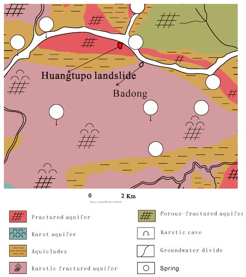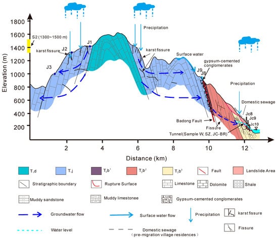 Previous studies have suggested that the groundwater source of the Huangtupo landslide is primarily from local precipitation based on its structural and lithological characteristics [9,11,12,13,14]. As shown in Figure 2 and Figure 3, the Middle Triassic Badong Formation (T2b2), which is composed of weakly permeable sandstone and mudstone layers that are more than 400 m thick, is distributed above the landslide and has traditionally been considered a relatively impermeable layer in previous regional hydrological investigations (Figure 4).Therefore, despite the presence of karstic limestone containing groundwater at the upper part of the slope above the landslide, previous studies on Huangtupo suggested that the karstic water in the upper part of the slope could not replenish the groundwater in the landslide due to being isolated by the sandstone and mudstone layers of the Middle Triassic Badong Formation (T2b2) [13]. Instead, the karstic water was thought to flow through the limestone formations on both sides of the landslide and discharge into the Yangtze River, without replenishing the groundwater in the landslide.